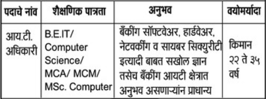 - आय.टी. अधिकारी – बैंकींग सॉफ्टवेअर, हार्डवेअर, नेटवर्कींग व सायबर सिक्युरीटी इत्यादी बाबत सखोल ज्ञान तसेच बँकींग आयटी क्षेत्रात अनुभव असणाऱ्यांन प्राधान्य